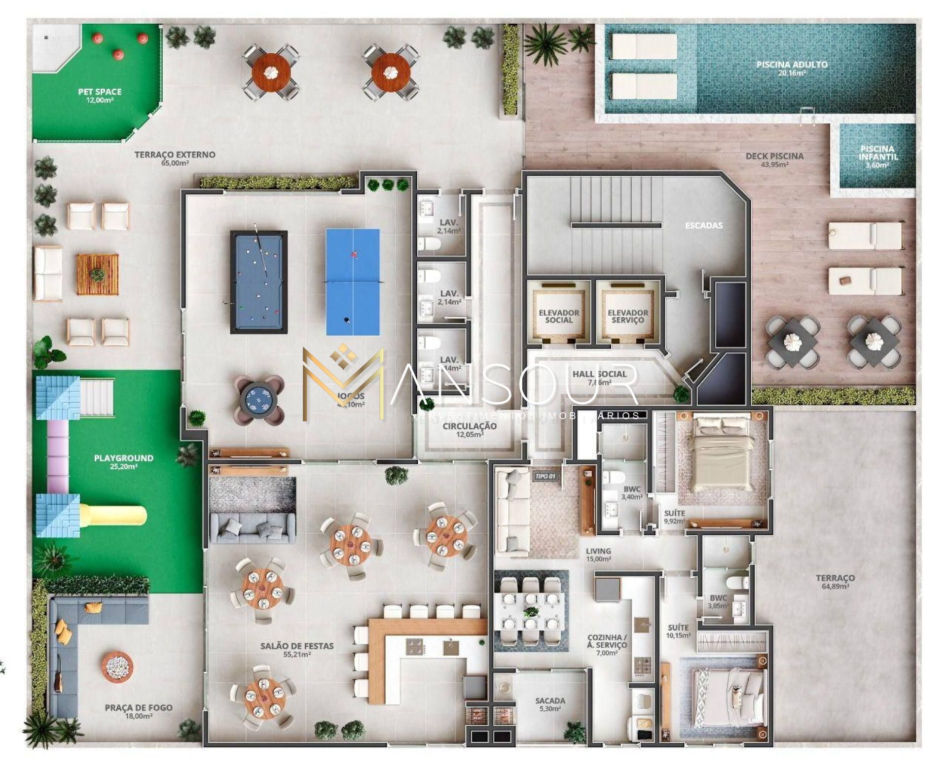 APARTAMENTO 02 dormitórios (sendo 01 suíte e 01 demi-suíte) Living integrado Cozinha Lavabo Sacada com churrasqueira a carvão Área de serviço Fechadura eletrônica Acabamento em gesso Piso em porcelanato 01 vaga de garagem EMPREENDIMENTO 37 unidades 03 apartamentos por andar 02 elevadores Hall de entrada decorado Interfone Portão eletrônico Sensores de presença nas áreas comuns ÁREA DE LAZER Piscina adulto e infantil Salão de festas Academia Sala de jogos Playground Pet Space