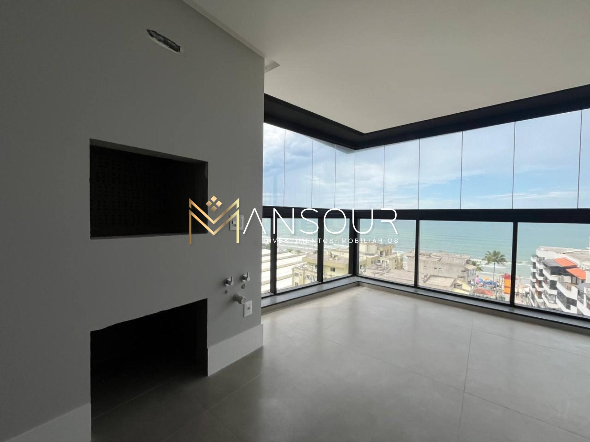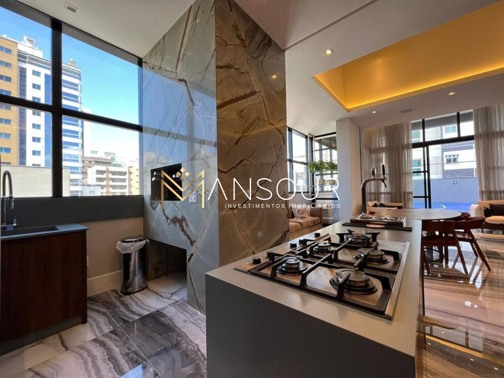 Sacada com churrasqueira integrada ao living